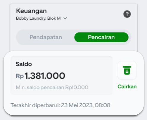 Peran Pemiliki usaha dapat melihat nominal saldo yang saat ini dimiliki di Beranda atau menu Keuangan tab ‘Pencairan’.