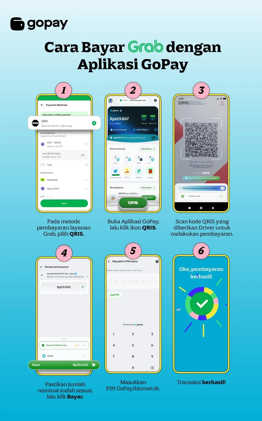 Dengan hadirnya metode pembayaran QRIS dari Grab, kamu bisa menggunakan aplikasi GoPay untuk membayar langsung ke driver Grab. Praktis, cepat, dan tetap aman—GoPay selalu memberikan solusi terbaik untuk setiap kebutuhanmu.