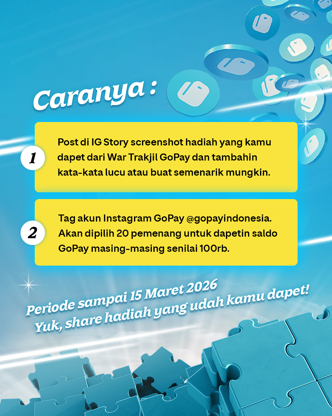 Kalau kamu udah berhasil ngumpulin puzzle dan dapetin hadiah War Trakjil, jangan berhenti sampai di situ dulu! Kamu juga punya kesempatan lain buat dapetin hadiah tambahan lewat media sosial GoPay @gopayindonesia, lho.