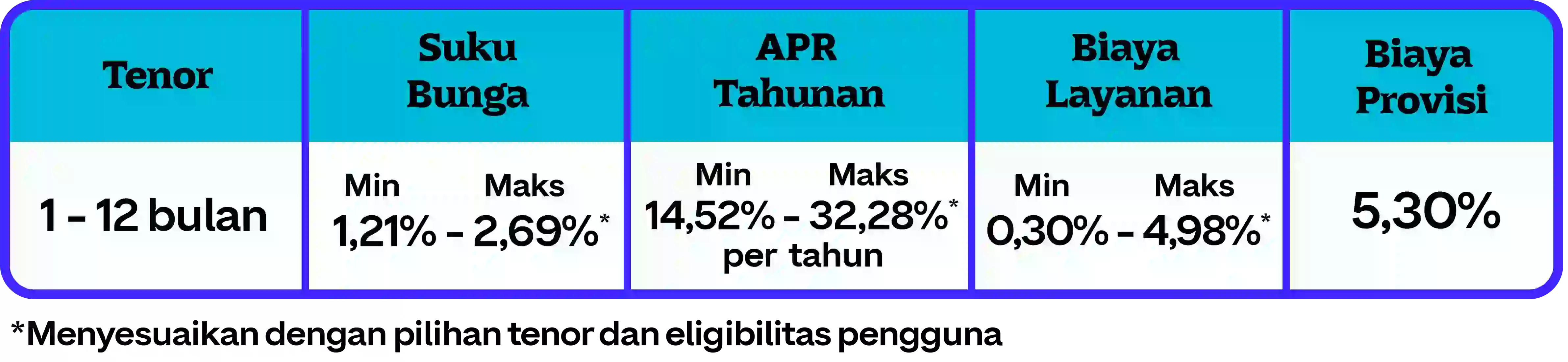 Ada banyak keuntungan GoPay Pinjam yang bisa didapatkan, seperti pilihan tenor yang fleksibel mulai dari 1 hingga 12 bulan, bunga mulai dari 1,13% hingga 2,69%, Annual Percentage Rate (APR) dengan minimal 17,6% dan maksimal 36% per tahun, biaya layanan mulai dari 2,62% hingga 5,05%, serta biaya provisi yang pastinya ringan cuma 1%. Selengkapnya, cek informasinya di bawah ini: