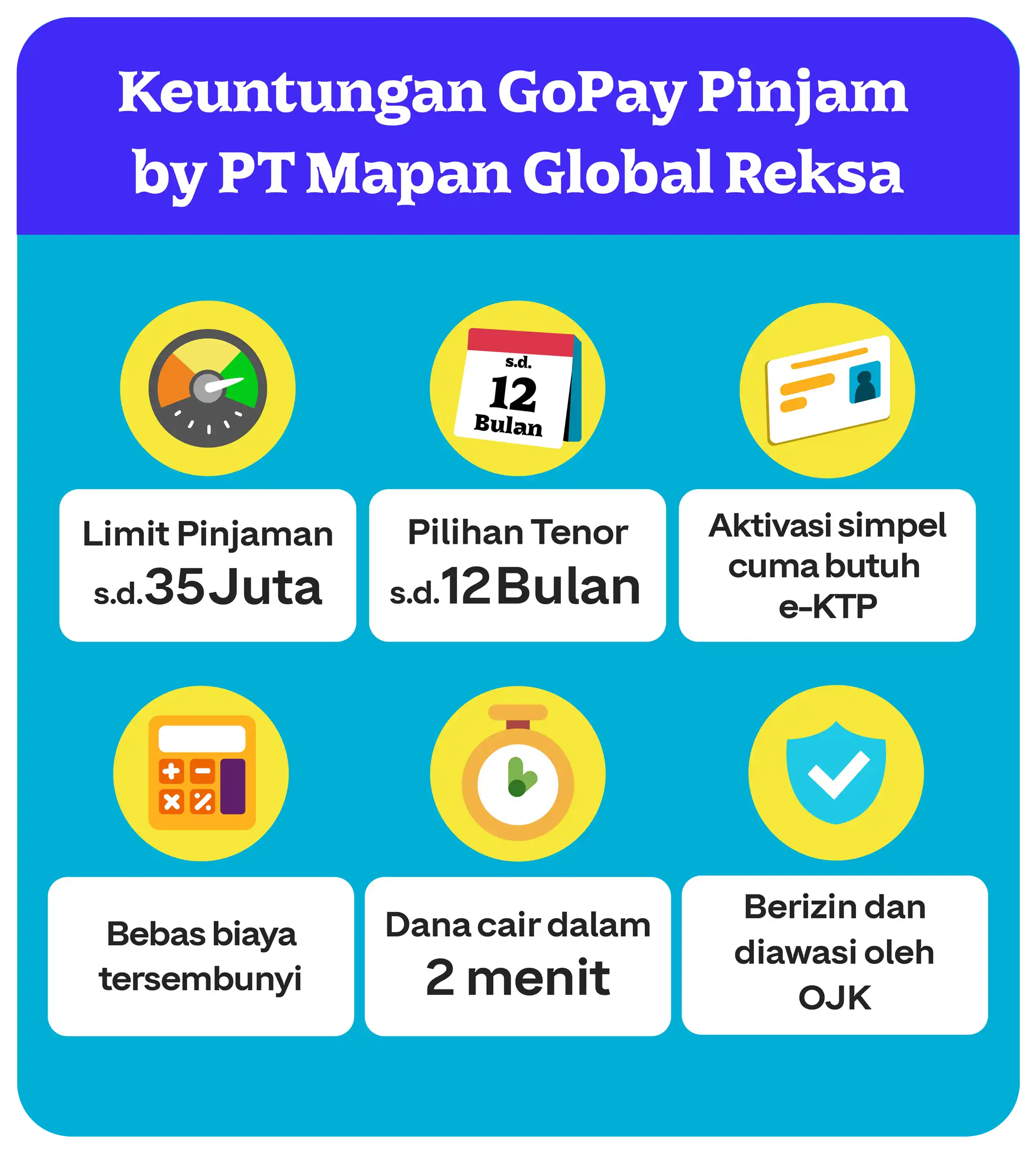 Mulai dari kebutuhan harian, usaha kecil-kecilan, sampai biaya pendidikan, GoPay Pinjam oleh PT Mapan Global Reksa (Findaya) yang sudah berizin dan diawasi oleh Otoritas Jasa Keuangan, hadir spesial bantu kamu bisa lebih tenang penuhi semuanya, dengan kasih pinjaman tunai dengan limit hingga 35 JUTA. Tenornya juga beragam, mulai dari 1 bulan hingga 12 bulan dan sudah berizin serta diawasi oleh Otoritas Jasa Keuangan (OJK).