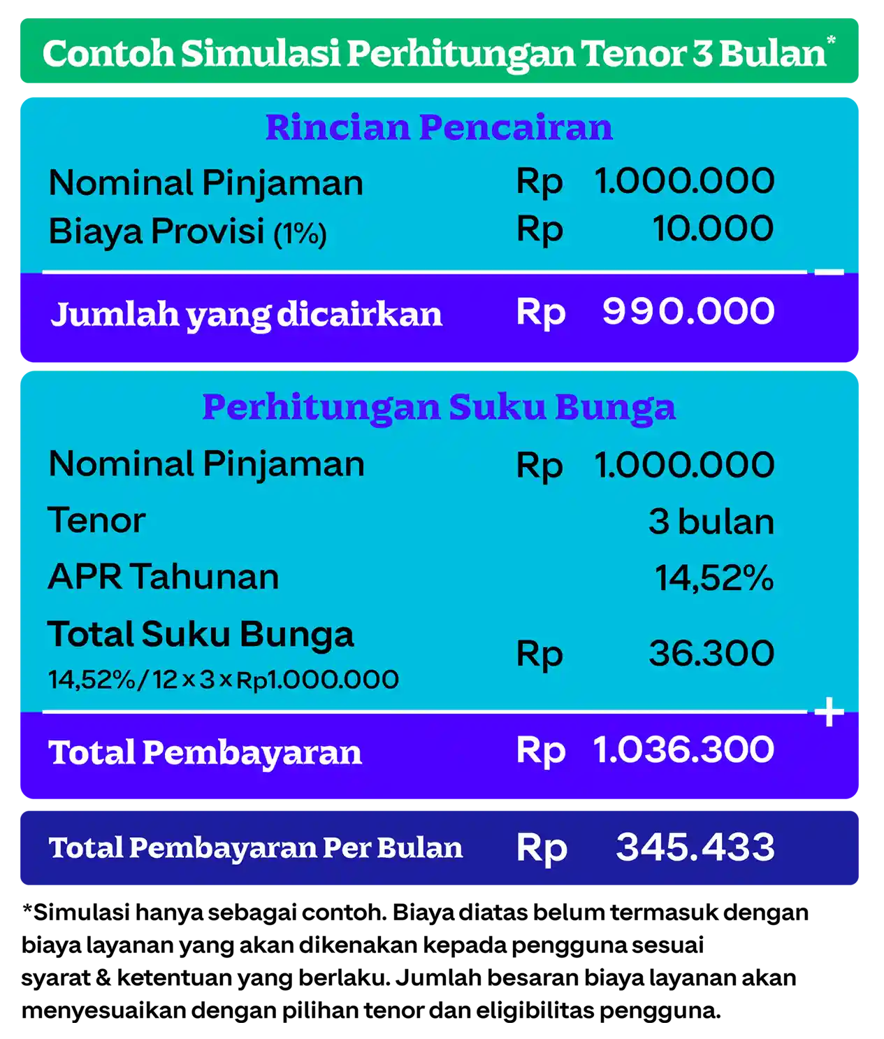 Biar gak bingung, berikut simulasi dan bagaimana biaya GoPay Pinjam dikenakan pada cicilanmu, contoh di bawah ini menggunakan perhitungan bila kamu memilih tenor 3 bula, ya. Untuk biaya yang akan dicairkan, kamu bisa lihat pada bagian Rincian Pencairan, sedangkan untuk biaya suku bunga yang perlu kamu cicil setiap bulannya, ada pada bagian Perhitungan Suku Bunga: