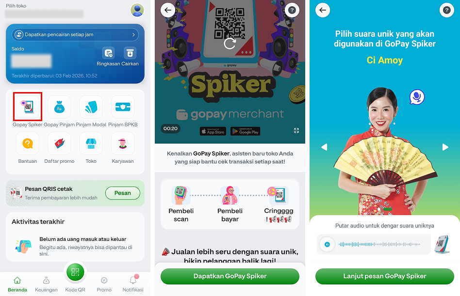 Pesan GoPay Spiker dengan karakter suara pilihanmu langsung dari aplikasi GoPay Merchant: