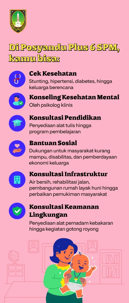 Yuk, datang ke Posyandu Plus 6 SPM di RW terdekatmu dan manfaatkan fasilitas ini bareng keluarga! Jadikan kotamu lebih sehat, nyaman, dan maju~