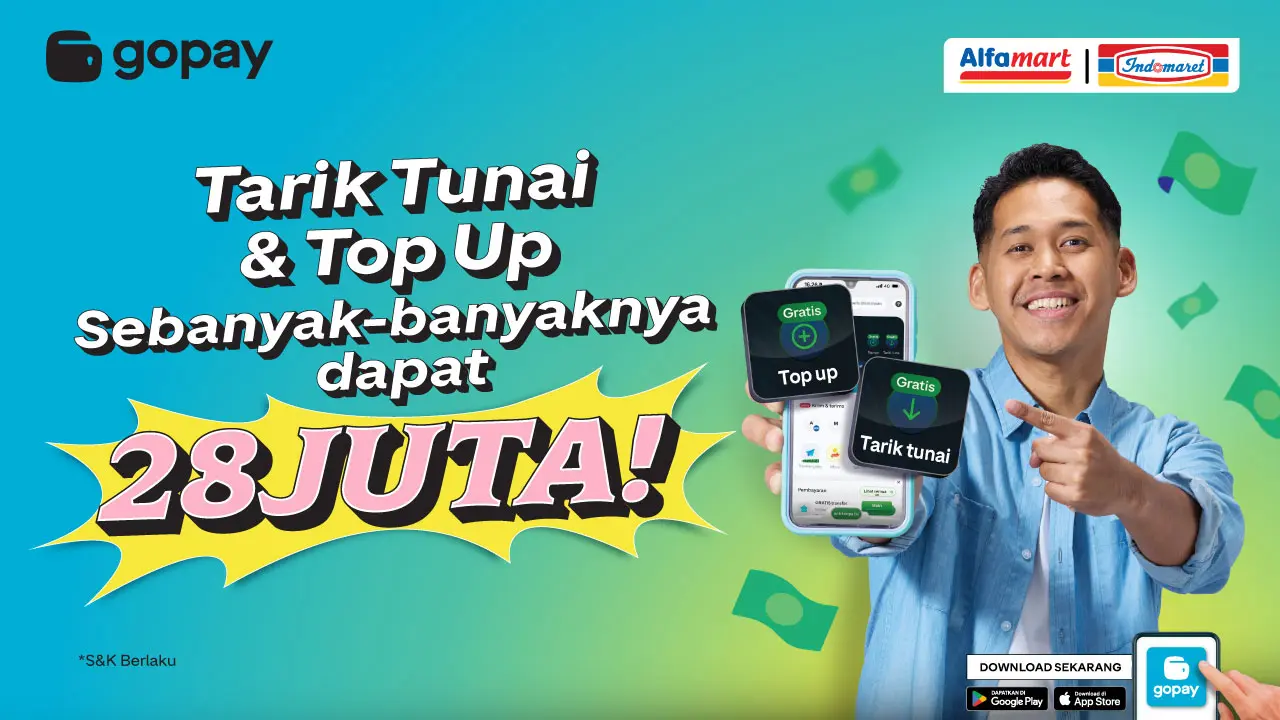 Isi saldo dan tarik tunai di minimarket jadi nggak biasa aja karena ada hadiah menarik dari GoPay deh. Kamu bisa top up tarik tunai GoPay dengan mudah, plus dapetin hadiah total Rp28 juta.