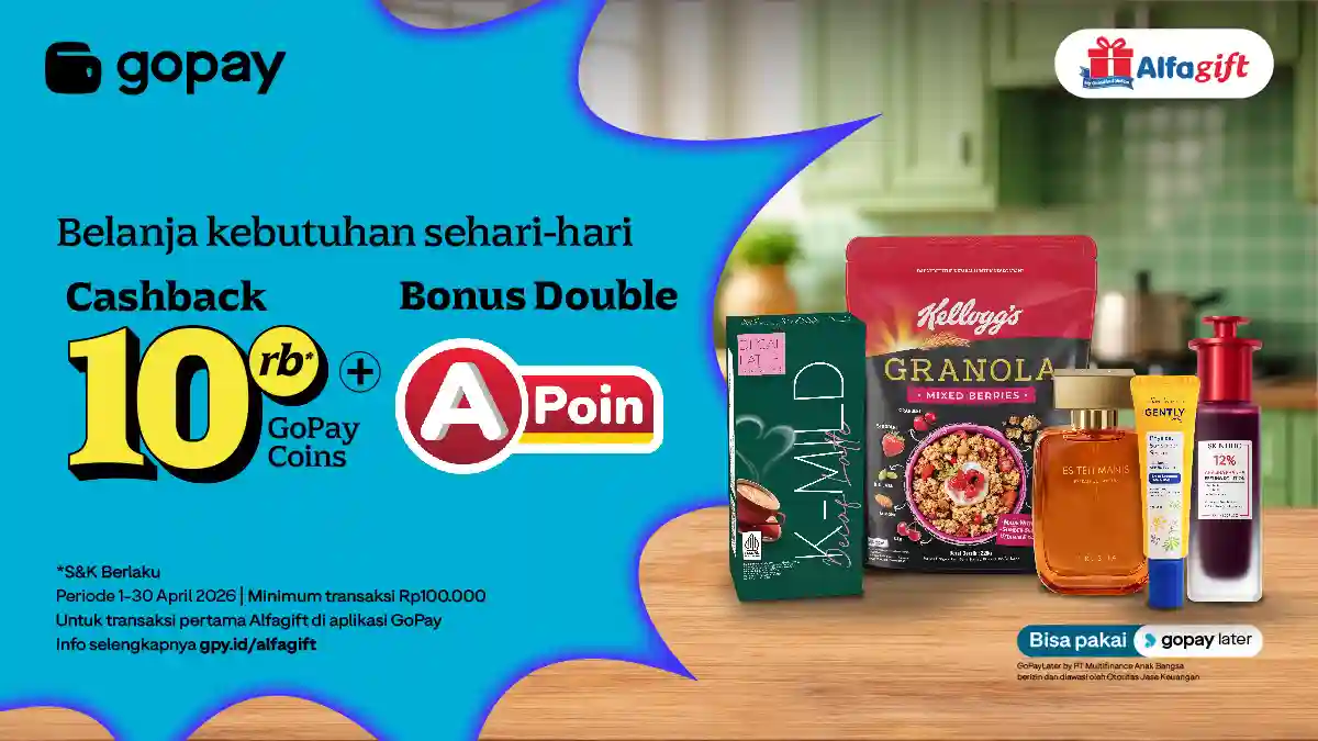 - Program Double A-Poin berlaku untuk setiap transaksi menggunakan pembayaran GoPay dan GoPay Later di Alfagift.