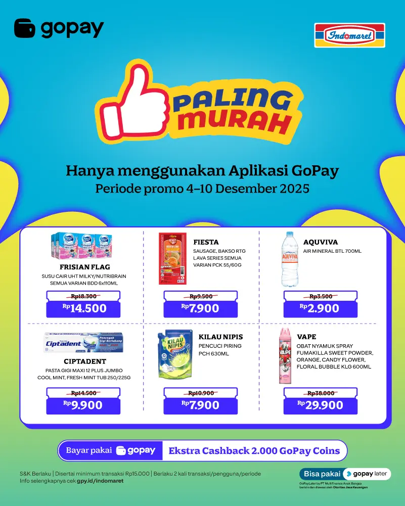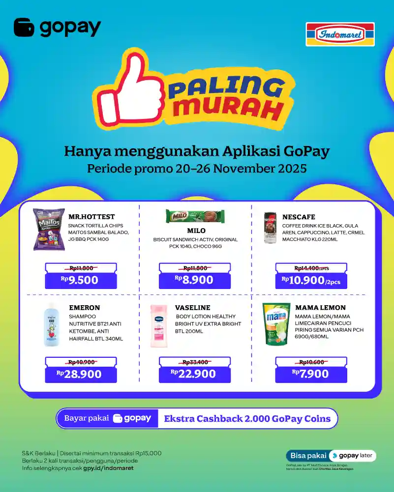 - Cashback maksimum 5.000 GoPay Coins untuk pembelian di Toko Indomaret Point.